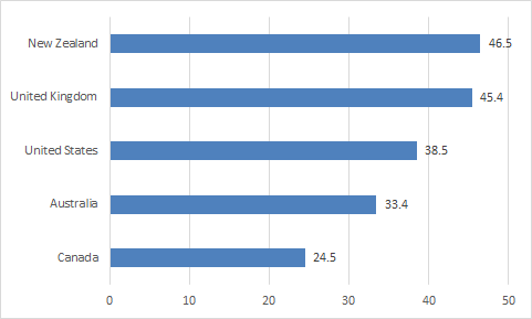 Figure 1: Proportion of births out of wedlock, 2011, Anglo-Saxon countries