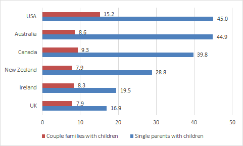 Child poverty rates in single parent and couple families, Anglo-Saxon countries