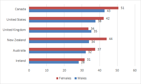 Figure 2 shows that the stark reversing of the gender gap in educational attainment shown in figure 1 was somewhat more recent in the US, UK and to a lesser extent in Ireland and Australia. In the UK and USA, educational attainment by gender was pretty equal for the earlier generation of graduates as compared to today’s 25 to 34-year-olds. The reversing of the gender gap in educational attainment dates back several decades in Canada and New Zealand.