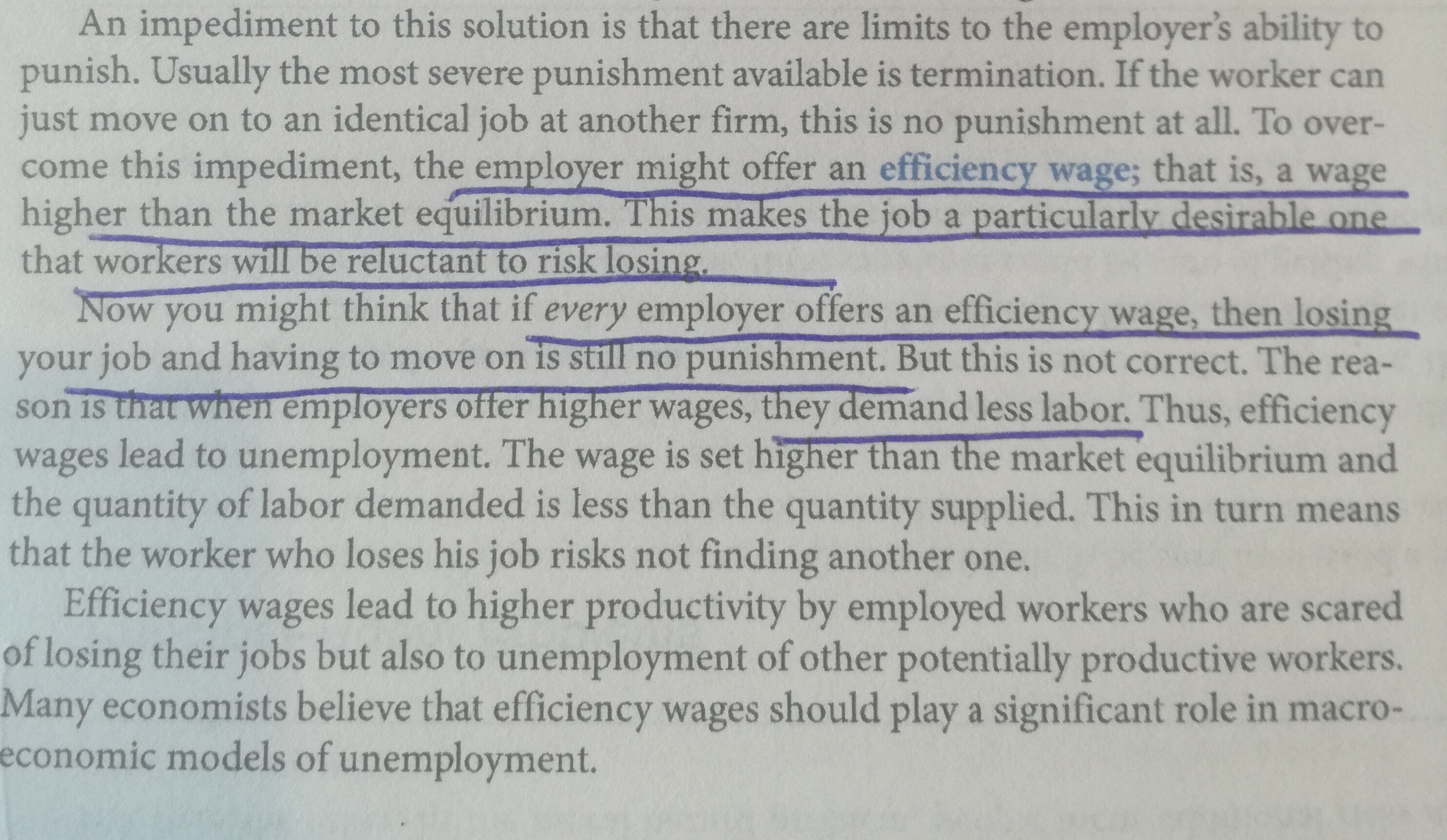 … it pays each firm to increase its wage to eliminate shirking. When all firms do this, the average wage rises and employment is reduced. In equilibrium, all firms pay a wage above the market clearing level, creating unemployment. Since jobs are scarce and rationed, the loss of a job can involve a lengthy spell of unemployment. The reserve army of the unemployed acts as a discipline device making shirking costly (Katz 1986, pp. 240-41).