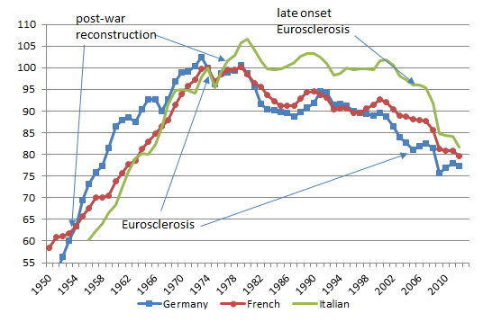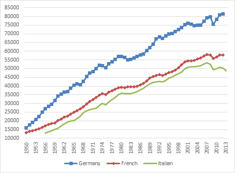 The PIGS had three distinct phases in their post-war growth. Rapid growth up until about the mid 70s. Growth at about the trend rate of growth of 1.9% until about 2000 in the case of Italy. This was followed by slow decline then rapid decline after the global financial crisis.