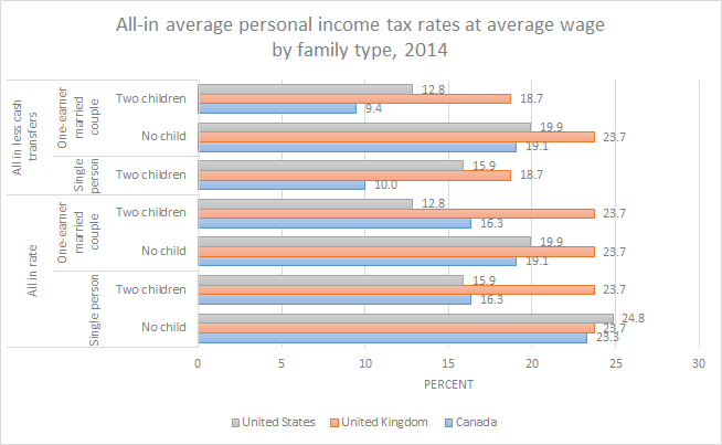 US, UK and Canadian all-in average personal income tax rates at average wage by family type