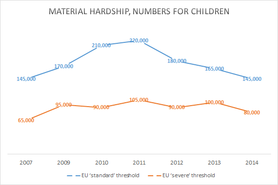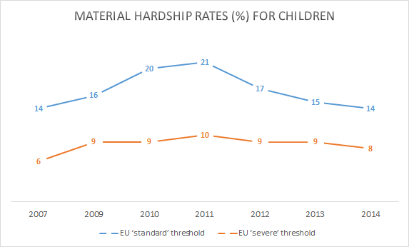 The material hardship measure shows a falling child material hardship rate using a threshold equivalent to the ‘standard’ EU level, down from a peak of 21% immediately after the GFC to 14% in 2014.