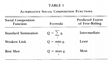 The classic example of a weakest shot public good by that brilliant applied price theorist Jack Hirschleifer is a dyke or a levee wall around a town. It is only as good as the laziest person contributing to its maintenance on their part of the levee. Vicary (1990, p. 376) lists other examples:
