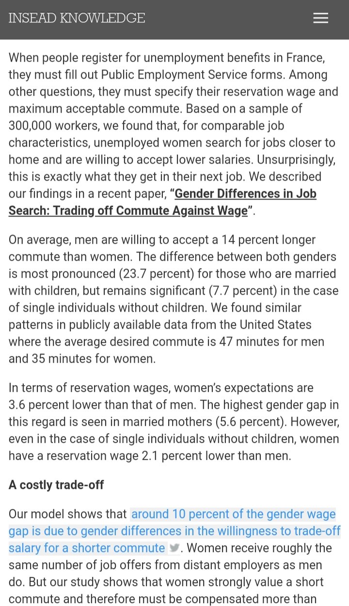 The best research on the gender pay gap these days relies upon fortuitous datasets. In this case, the French public employment form asks about maximum commuting time and minimum acceptable pay in your next job.
