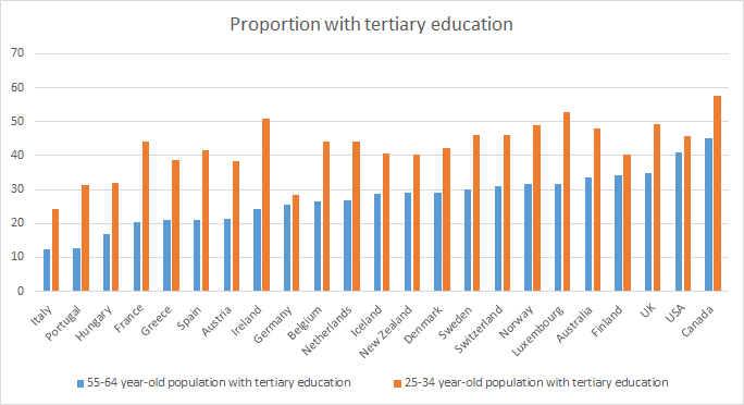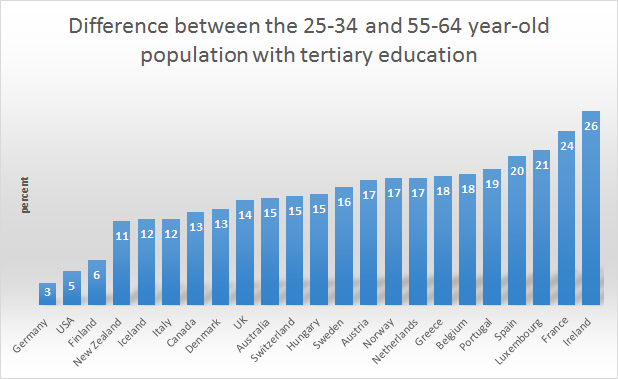 Some countries have experienced large increases in the number of young people graduating from University when compared to their parents. Germany and the USA aside, all countries have experienced a noticeable increase in young adults with tertiary degrees.