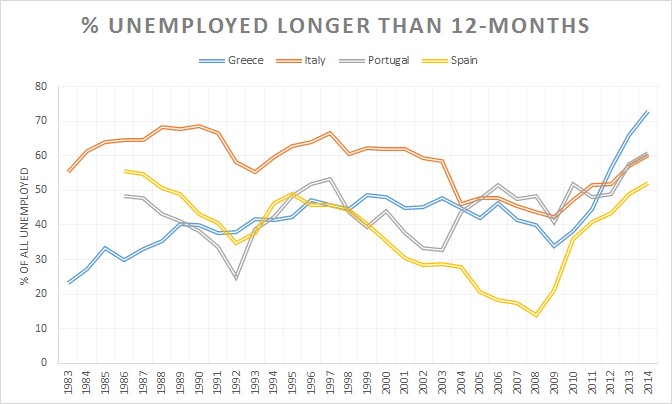 Nothing much happened to long-term unemployment in Italy or Portugal in recent decades. Spanish long-term unemployment fell in line with the economic boom in Spain over the 1980s and 1990s up until the global financial crisis.