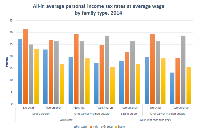 Portuguese, Italian, Greek and Spanish all-in average personal income tax rates at average wage by family type, 2014