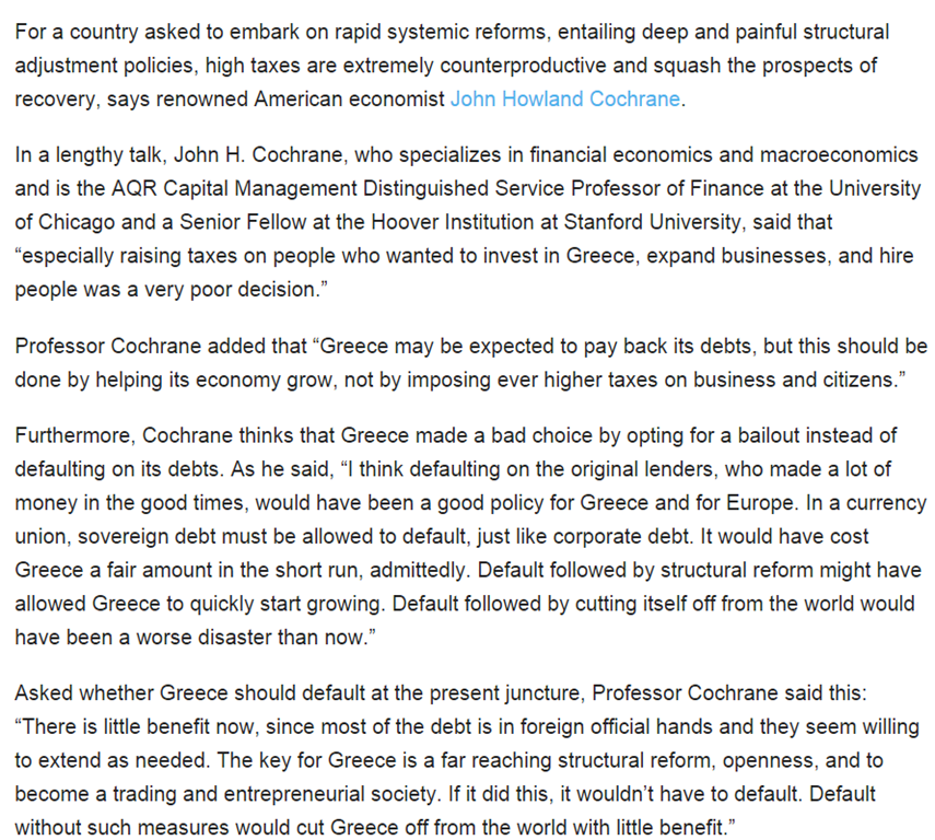 John Cochrane is the latest to join the list of economists who pointed out that Greece should have defaulted several years ago rather than put up taxes. Tax rises just made everything worse and put off the day when Greece had to reform through deregulation and privatisation.