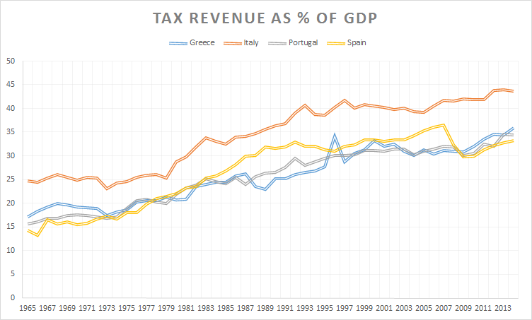 Tax revenue as % of Portuguese, Italian, Greek and Spanish GDP