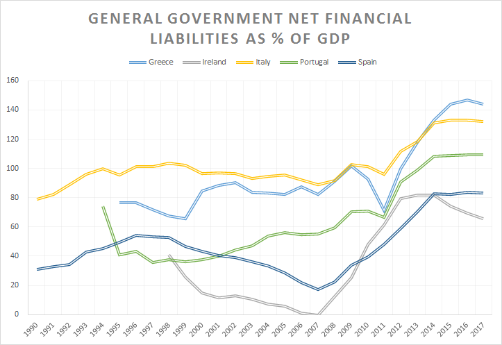 General government net financial liabilities as % Portuguese, Italian, Greek, Spanish and Irish GDPs