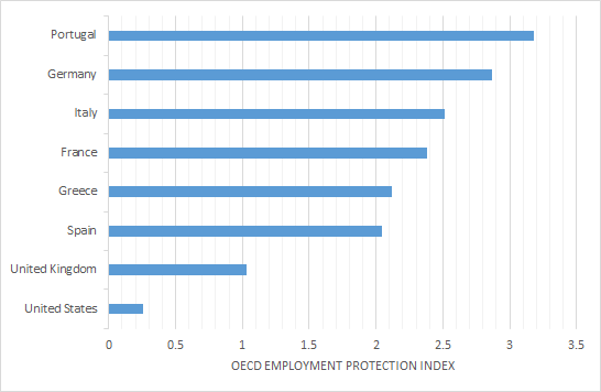 Much easier to fire someone in the USA or UK than on continental Europe. Greece and Spain aren’t that bad by continental European standards for employment law protections against dismissals of individuals.