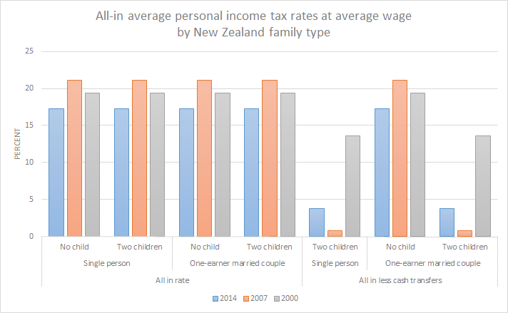 New Zealand 2000, 2007 and 2014 all-in average personal income tax rates at average wage by family type