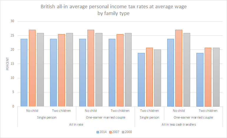 British all-in average personal income tax rates at average wage by family type, 2000, 2007, 2014