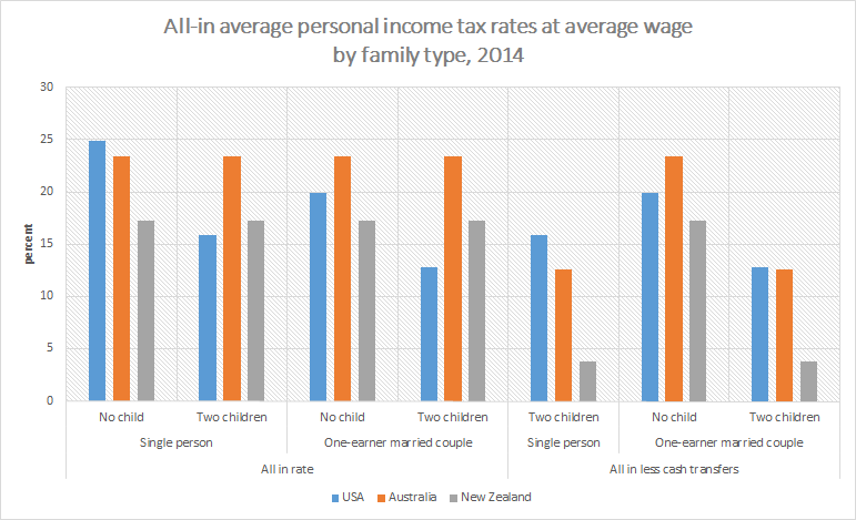 US, Australian and NZ all-in average personal income tax rates at average wage by family type