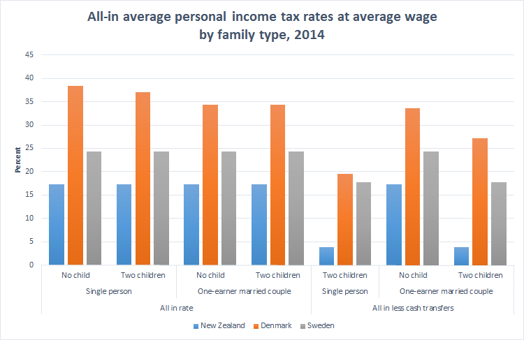 Better than Sweden! All-in average personal income tax rates at average wage by New Zealand, Swedish and Danish family type