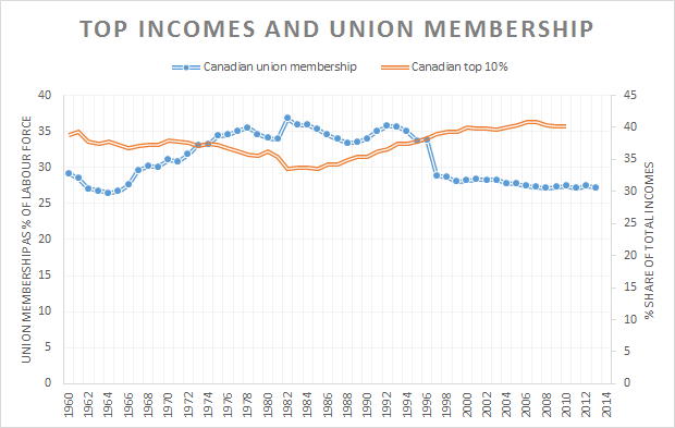 The Canadian ruling classes even more incompetent than their transnational co-conspirators over in Italy. There appears to have been next to no decline in union membership in Canada. The Canadian top 10% is not earning any more than back in the 60s.