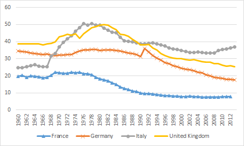 Figure 1: French, German, Italian and British trade union densities, 1960 – 2013