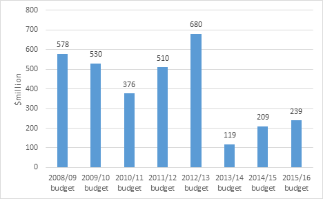 Figure 1: State-owned enterprise welfare, Vote Transport and Vote Finance (KiwiRail), Budgets 08/09 to 15/16