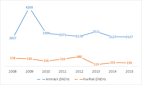 Figure 1: Amtrak and KiwiRail bailouts, (exchange rate US$1:NZ$1.53), 2008 – 2015
