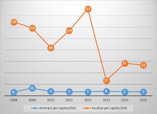 Figure 2: Amtrak and KiwiRail bailouts per capita (2014 populations), (exchange rate US$1:NZ$1.53), 2008 – 2015