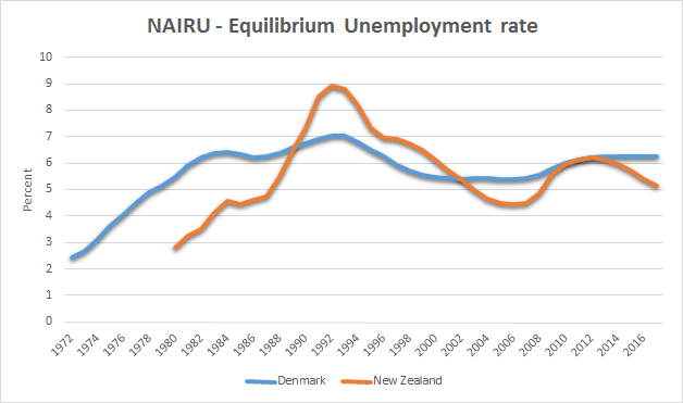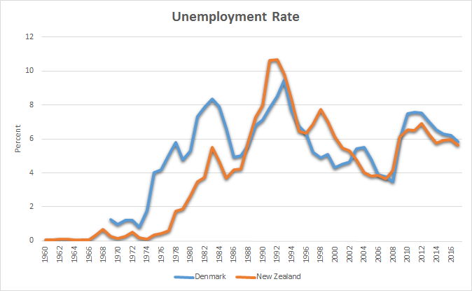 The Labour Party wants the New Zealand labour market to be more like that in Denmark. The early 1990s recession New Zealand aside, New Zealand has always had a lower equilibrium unemployment rate than Denmark.