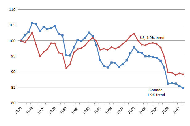 Real GDP per Canadian and American aged 15-64, 2013 price level, updated 2005 EKS PPP, detrended, 1970-2013
