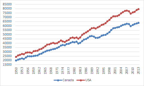 Figure 2: Real GDP per Canadian and American aged 15-64, converted to 2013 price level, updated 2005 EKS purchasing power parities, 1950-2013