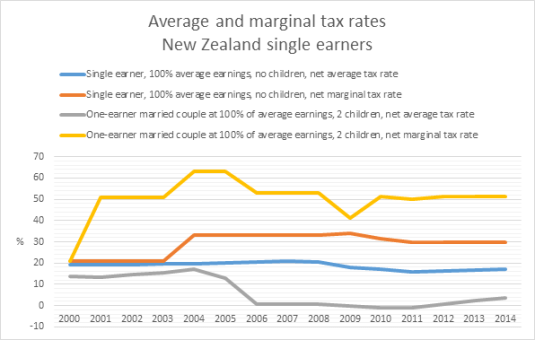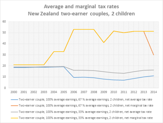 For a married couple with one income, as the above chart shows, their average tax rate has been about zero for a good 10 years now but their net marginal tax rate is a good 50% or more because of abatement rates on family tax credits, which is a skewed incentive situation. A large income effect from the family tax credit encourages the consumption of leisure but a high marginal tax rate discourages working more.