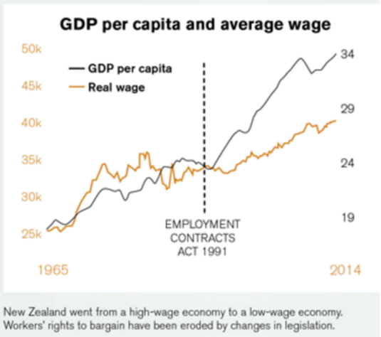 As shown in the chart conveniently compiled by the New Zealand Council of Trade Union, there was 20 years of real wage stagnation until the passage of the Employment Contracts Act in 1991.
