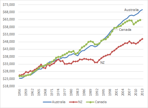 Figure 1: Real GDP per New Zealander, Canadian and Australian aged 15-64, converted to 2013 price level with updated 2005 EKS purchasing power parities, 1956-2013