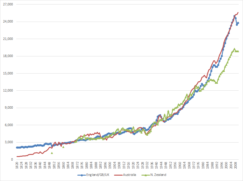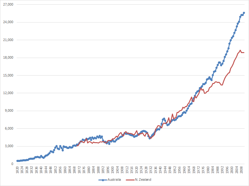 in development economics, economic growth, economic history, growth disasters, growth miracles, macroeconomics Tags: Australia, British economy, convergence, lost decades, Maddison database, New Zealand