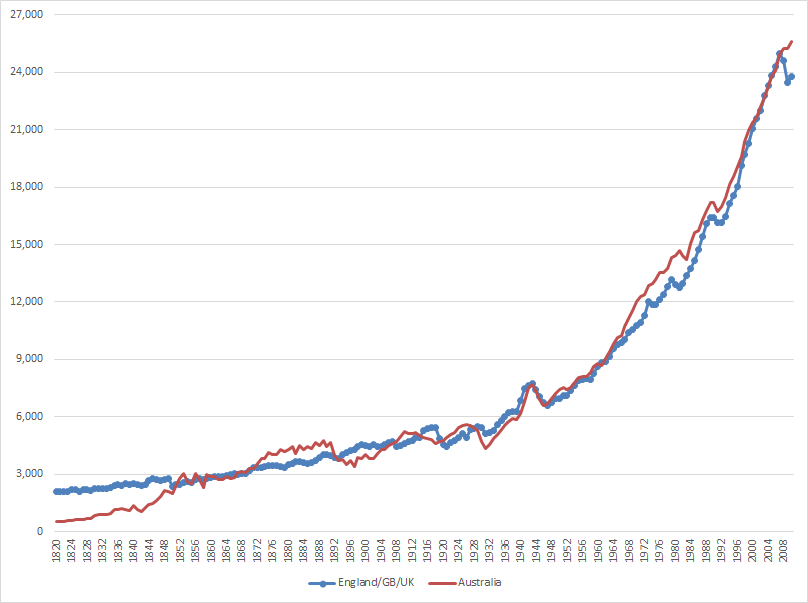 Figure 2: British and Australian GDP per capita (1990 Int. GK$PPP), 1820 – 2010