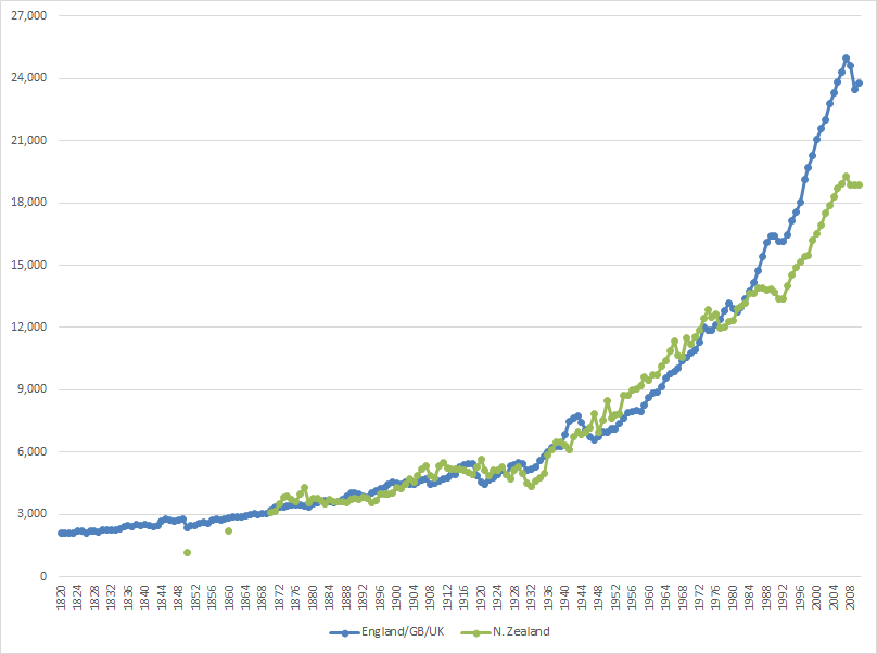 Figure 3 shows that New Zealand was richer than the UK in the mid-20th century. The lost decades in New Zealand from 1974 to 1992 let the sick man of Europe overtake New Zealand before Thatchernomics caused a growth spurt in the UK to take the British well ahead.