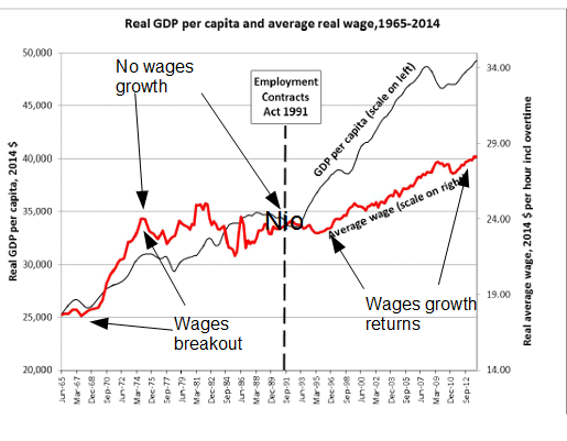 As shown in the chart conveniently compiled by the New Zealand Council of Trade Union, there was 20 years of real wage stagnation until the passage of the Employment Contracts Act in 1991.