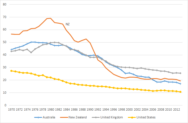 Figure 1: Trade union densities, New Zealand, Australia, United Kingdom and United States, 1970–2013
