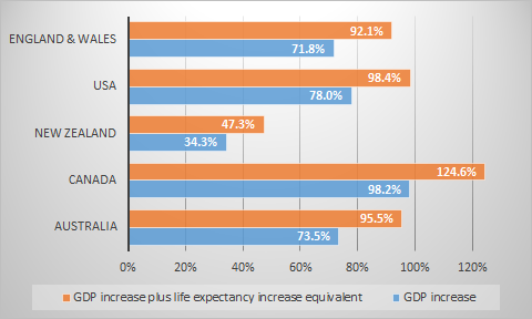 Figure 1: increase in real GDP and increase in real GDP plus life expectancy GDP increase equivalent, Australia, New Zealand, Canada, USA and England & Wales, 1965 to 1995