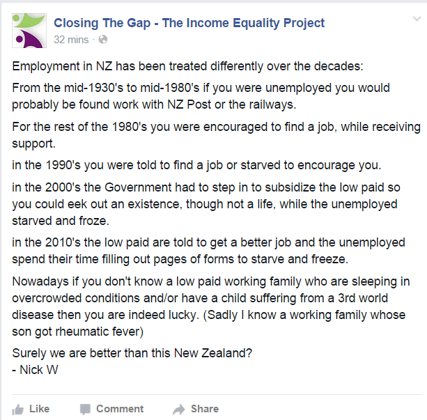 Today, Closing The Gap – The Income Inequality Project boldly claimed today that there was next to no unemployment in New Zealand prior to the onset of the curse of neoliberalism.