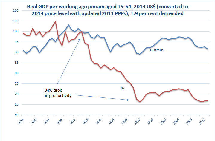 In the chart above, the base is 1974 which equals 100. A flat-line means annual growth equal to the trend rate of growth in the 20th century for the USA. A falling line means below trend growth; a rising line means above trend rate economic growth per working age Australian or New Zealander.