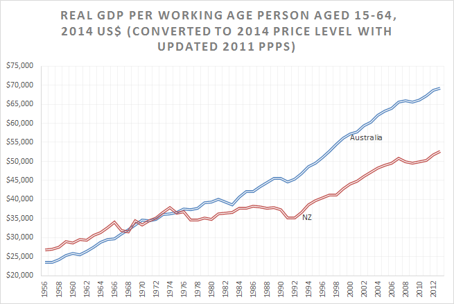 Figure 2: Real GDP per New Zealander and Australian aged 15-64, converted to 2013 price level with updated 2005 EKS purchasing power parities, 1956-2013, $US