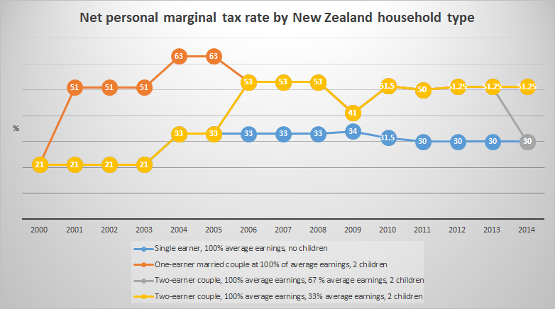 In 2000 in New Zealand, the marginal tax rates of single earners, married couples and dual income couples were 21%.