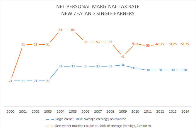 For a married couple with one income, as the above chart shows, their average tax rate has been about zero for a good 10 years now but their net marginal tax rate is a good 50% or more because of abatement rates on family tax credits, which is a skewed incentive situation. A large income effect from the family tax credit encourages the consumption of leisure but a high marginal tax rate discourages working more.