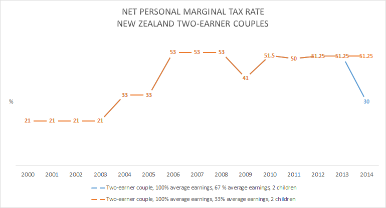 - to 33% in 2004 for a two earner couple with the second earner earning 67% of average earnings and then increased further to 53% in 2006 and stayed high until 2014 when their marginal income tax rate dropped to 30%; and