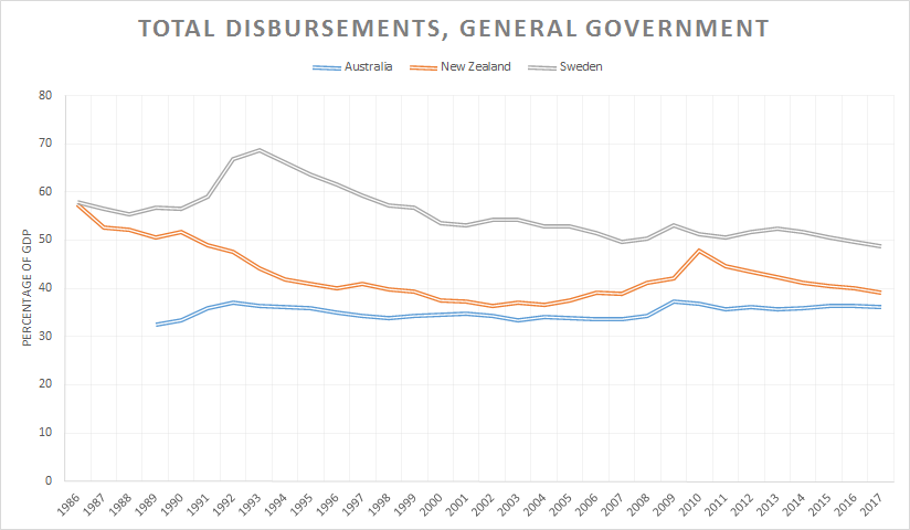 I came across this data showing that New Zealand and Sweden had the same sized public sectors in the mid-1980s some years ago. The data could not be found again for a long time in the OECD statistical databases. One reason was the OECD changed its name to general disbursements.