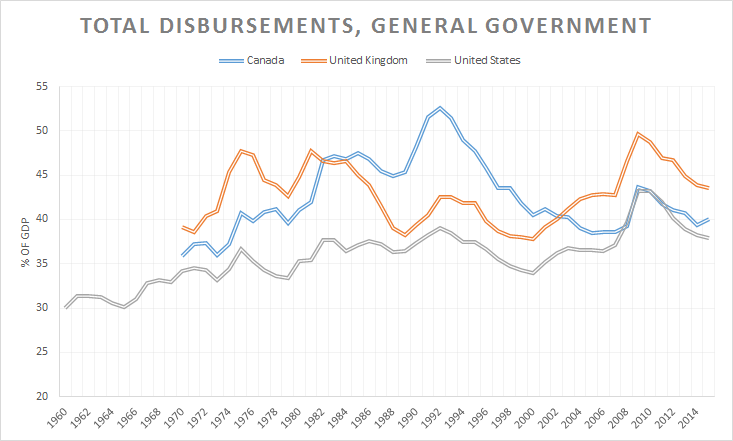General government expenditure as % of US, British and Canadian GDP since 1960