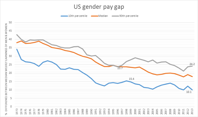 The gender gap lingers at the top of the labour market despite the quite substantial wage gains for women as compared to men over the past 15 years. The Economic Policy Institute dismissed the substantial gains as modest despite their own documenting of them.
