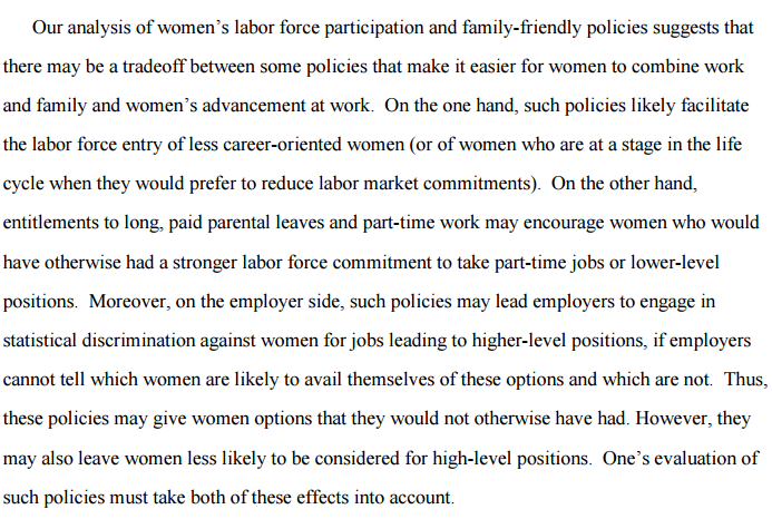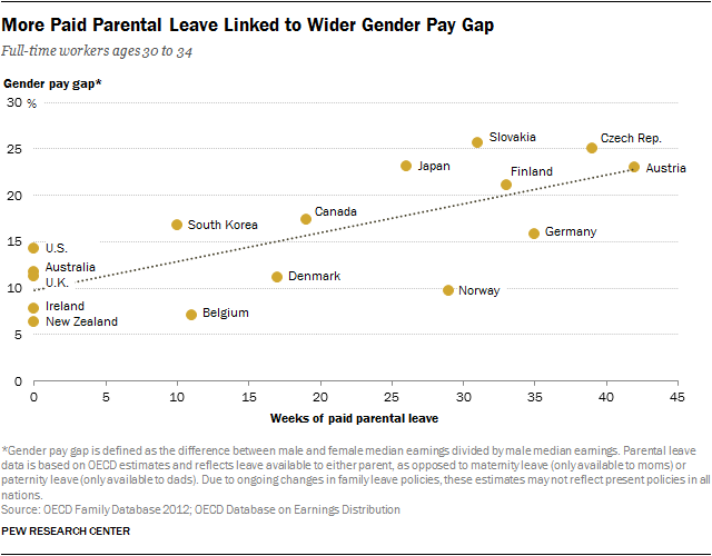 - Long, paid parental leaves and part-time work may encourage women who would have otherwise had a stronger labor force commitment to take part-time jobs or lower-level