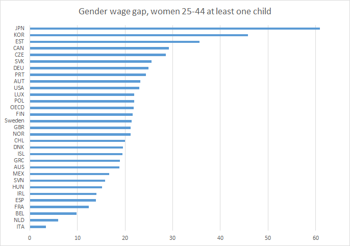 Most countries have less generous family subsidies so Claudia Goldin’s usual explanation applies to their falling gender wage gaps