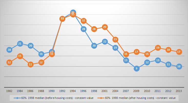 Figure 1: % child poverty in New Zealand (before and after housing costs), 60% 1998 median constant value, 1982 – 2013