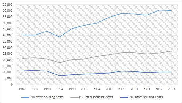 Figure 2 shows that real equivalised household income after housing costs has not grown and in fact has fallen for the bottom 10% of the income distribution in New Zealand.
